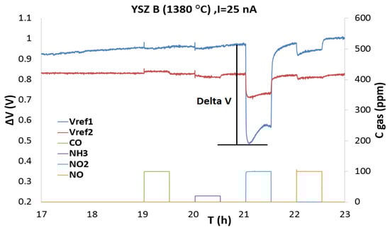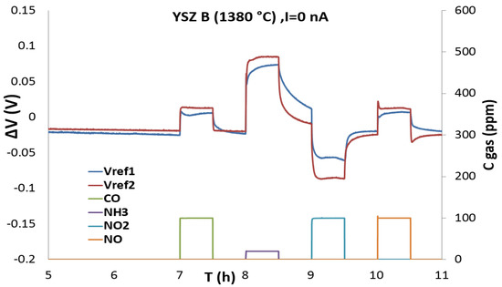 Responses (ΔV) of the three-electrodes sensors with YSZ B at 450 °C during pulses of CO (100 ppm), NH3 (20 ppm), NO2 (100 ppm) and NO (100 ppm) in base gas with a polarization current of 25 nA.