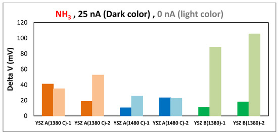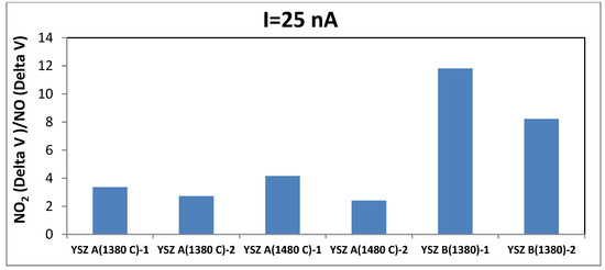 The responses of different sensors (YSZ A 1380 and 1480 °C, YSZ B 1380 °C) to 20 ppm of ammonia are shown in Figure 4. This bar chart clearly illustrates that without polarization the sensors with YSZ B give the most significant responses toward NH3. Regarding NO2/NO signal ratio, although the sensors based on commercial YSZ ink A sintered at 1380 °C show the highest response to both gases, Figure 5 shows that the most relevant sensor in regards of NO2 response is the one with YSZ B.