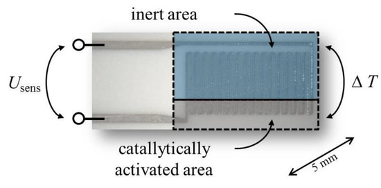 Part of the sensors front side: A screen-printed Pt/PtRh thermopile structure measures the temperature gradient between an inert and a catalytically activated area by a thermovoltage. Gas reactions on the catalyst affect the signal.