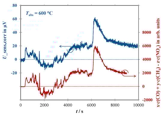 To relate the sensor signal to the exhaust composition and to determine the quality of the sensor performance, the measured thermovoltage is compared to FTIR data during the whole batch firing process. We found CO and CH4 to be the main reducing components in the exhaust, but also NO arises in certain phases of the combustion process. The other components were determined to occur only in low concentrations (<100 ppm) and therefore, they should not considerably influence the course of the signal representing various exhaust compositions during the batch process.