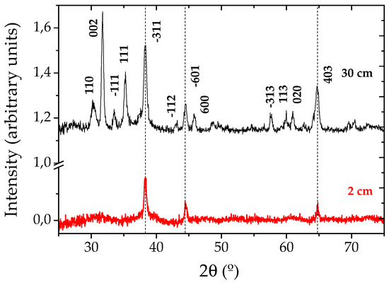 GIXRD measurements were performed at small angle (θ = 0.5°) to increase the interaction volume of the thin Ga2O3 grown NW layer with the incident X-rays. Figure 2 shows two spectra corresponding to the samples grown at 2 and 30 cm from the evaporating source. These spectra perfectly match the standard pattern of monoclinic β-Ga2O3 (JCPDS card 43-1012), with lattice parameters a = 1.2227 nm, b = 0.30389 nm, c = 0.58079 nm, α = γ = 90° and β = 103.82°, in agreement with similar works [8,9,10]. Some additional peaks can be observed, corresponding to the gold catalyst.