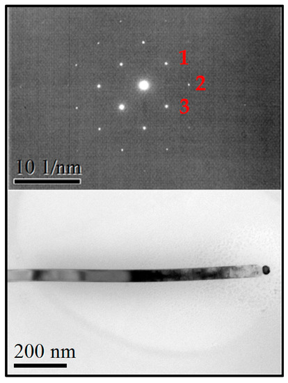 Gallium Oxide nanowire (down) and its selected area electron diffraction with spots labeled as 1, 2 and 3 corresponding to , and respectively (up).