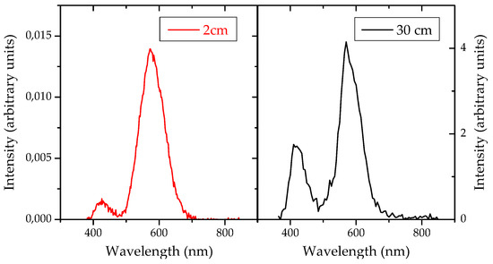 In each spectrum of the two samples with NWs, two different bands can be observed. A strongest one, centered at about 580 nm (yellow) with quite uniform intensity along the whole sample’s surface. And a weaker band, centered at about 430 nm (blue) that appears only in the areas with a high NW density. In both cases showing Gaussian fitting curves, whose width is compatible with other reported experiments [6], where these bands have been assigned to exciton recombination at defects sites, such as oxygen vacancies or Ga-O vacancies. The sample at 30 cm from the precursor source exhibits a stronger overall PL intensity, and a higher intensity of the blue component, that becomes comparable to the yellow one [8,9,10]. This is shown in Figure 4.