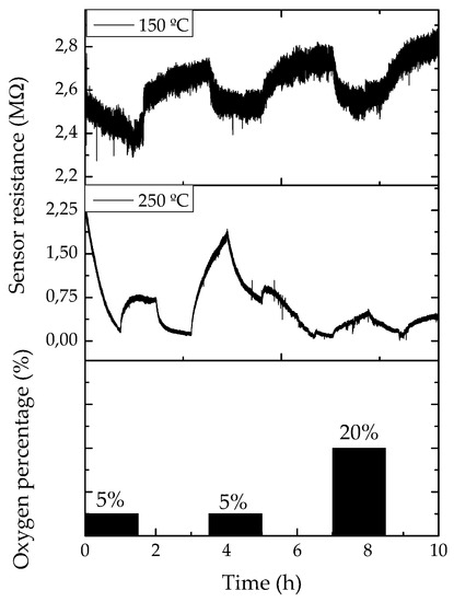 The resistance evolution of the contacted single Ga2O3 NWs were studied between room temperature (~25 °C) and 250 °C towards different concentrations of oxygen (O2), carbon monoxide (CO), nitrogen dioxide (NO2), relative humidity (RH) and ethanol (EtOH), all diluted in dry synthetic air. In this work we only focused on the response towards relative humidity and oxygen, because their effect can be clearly monitored at this relatively low temperatures, as Ga2O3 usually is operated at temperatures above of 500 °C [11]. In the presence of oxygen, the response traces show an apparent decrease in the resistance. The highest and fastest responses were measured at 250 and 150 °C, respectively, and are presented in Figure 5. On the other hand, the response to relative humidity is considerably high, even at room temperature, with changes up to 20%, with response times below 30 min and recovery times of 1 h, approximately.