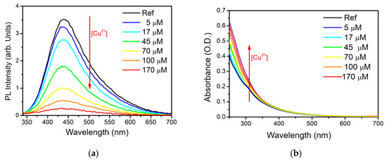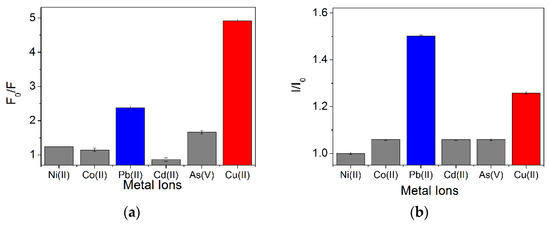 Substantially no sensitivity was found to Ni2+, Co2+, Cd2+ and As5+ as reported in Figure 2 which shows the response of PL (Figure 2a) and absorption (Figure 2b) to a fixed concentration of 100 μM for the different ions. Interestingly, the fluorescence quenching produced by each ion is not proportional with the respective transmittance variation. In other words, copper and lead ions exhibit different ratio of the fluorescence quenching to the trasmittance variation.