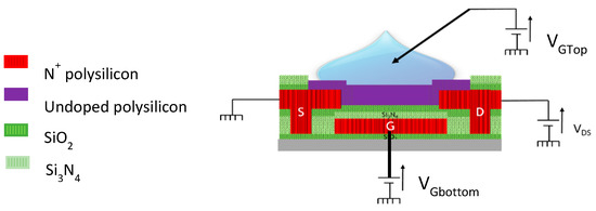 Electrical contacts are insulated from the liquid. The active layer made of silicon is covered with a very thin native oxide. In the dual gate mode, 6 μL of different liquids are dropped on the active area and polarized for Dual Gate operation. As expected, the top gate voltage influences the transfer characteristic as shown Figure 2.