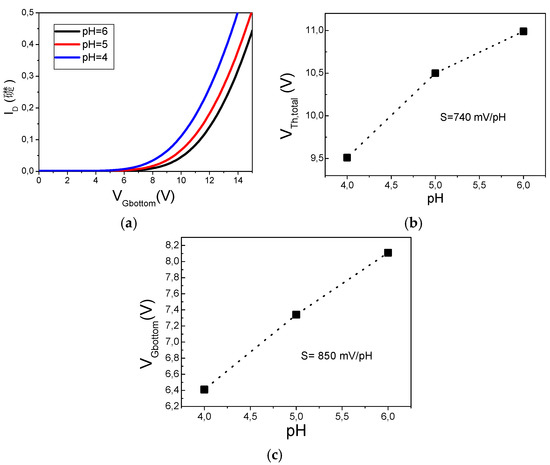Transfer characteristics are presented in Figure 3 for three pH values. In this case, the bottom gate voltage is varied and the top gate voltage is fixed to 0 V. As expected, a decrease in pH results in a shift of the transfer characteristic leading to a decrease in the threshold voltage (Figure 3a).