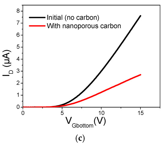 The second material we considered is nanoporous carbon. It was grown using an original approach involving the deposition of copper/carbon nanocomposite film followed by selective etching of copper in nitric acid allowing obtaining a nanoporous skeleton of carbon. As shown in Figure 5a,b, this material was successfully synthesized over the active layer made of silicon. The transistor was neither destroyed during the deposition of the copper/carbon film nor during the selective etching of copper using nitric acid. As shown Figure 5c, the transfer characteristic of the device is modified after the nanocarbon integration but maintains, however, a reasonable electrical characteristic sufficient for sensing applications.