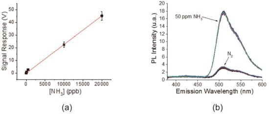 (a) Optical response of the fluorescein emission peak to five difference ammonia concentrations. The results were fitted to the equation: y = 0.0026 x (R2 = 0.999); (b) Ammonia sensor reversibility through six different N2/NH3 cycles [NH3] = 50 ppm.