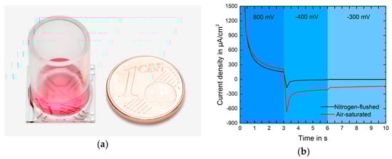 (a)Transparent electrochemical sensor chip with cell culture well (transparent plastic cylinder); (b) Current response of one cycle. The 3-step protocol enables cleaning of the electrode surface.