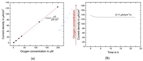 Oxygen was measured in cell culture before, during and after light exposure. The sensors were calibrated at 37 °C in cell culture medium equilibrated from 0.5 to 20.95% in the gas phase which corresponds to 1.6 to 198.2 μM dissolved oxygen. The sensitivity of the oxygen sensors was found to be −0.63 µAcm−2µM−1 and the offset was less than −1 µAcm−2 (Figure 2a). A linear dependency between current density and oxygen concentration was observed. This allowed for a 1-point calibration scheme during cell culture measurements. It was shown, that the sensors were longtime stable in cell culture medium comprising serum (Figure 2b).