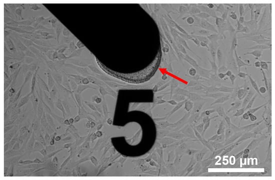 NIH-3T3 cells cultivated on the sensor chip surface. The arrow indicates the pHEMA based hydrogel on the working electrode.