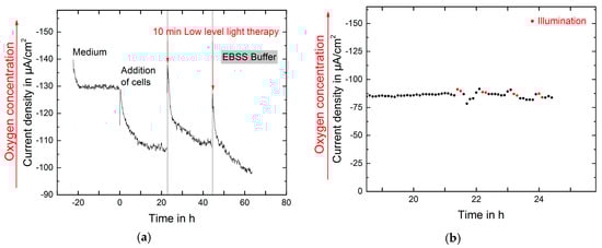 (a) Monitoring of the respiration of NIH-3T3 cells over three days. On two consecutive days low-level light therapy was applied and in consequence the oxygen concentration decreased significantly; (b) Oxygen measured in EBSS Buffer at room temperature: after 21 h four illuminations à 10 min take place.