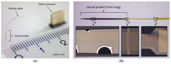 (a) 5 mm long silicon stiffened multichannel neural probe (30 µm thick and maximum 130 µm wide) with a monolithically integrated 25 mm long highly flexible ribbon cable (10 µm thick PI) connected to a base with a soldered 0.64 mm pitch SMD Omnetics connector; (b) Top view of the multichannel neural probe connected to the flexible cable with enlarged view of (a) PEDOT: PSS coated gold microelectrodes of different geometric areas (160 µm2 to 4000 µm2); (b) transition of the silicon stiffened shaft to the flexible cable and (c) widening of the gold conductive paths from 2 µm to 5 µm widths.