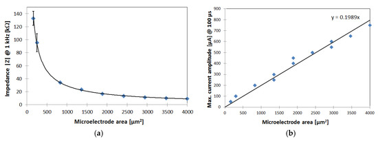 (a) In Vitro impedance measurement results of PEDOT: PSS coated gold microelectrodes with different geometric areas on the silicon stiffened shaft (measurements were done in Ringer’s solution and platinum counter electrode); (b) In Vitro evaluation of the maximum current amplitude for bipolar 100 µs long current pulses in Ringer’s solution with PEDOT: PSS counter electrode, before electrolysis occurs. Linear regression results in a charge injection capacity of approx. 2 mC/cm2.
