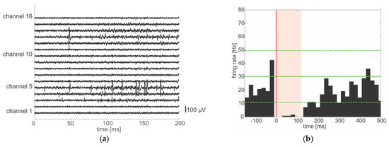 (a) Data traces of 200 ms duration showing data recorded 38 days after chronic implantation of the multichannel neural probe. Single unit activity can be observed on several channels; (b) Microstimulation effects on neural activity: single bipolar pulses (20 µA per phase, 100 µs phase duration) were applied at one electrode while the others were recorded. (P)eris(S)timulus(T)ime(H)istogram shows a suppression of activity directly after the pulse (red line at time 0) for 120 ms (red shaded area) at one microelectrode with spiking activity. Recovery of activity may take up to 400–500 ms. The green line depicts the average firing rate before electrical stimulation. Broken green lines depict two times the standard deviation.