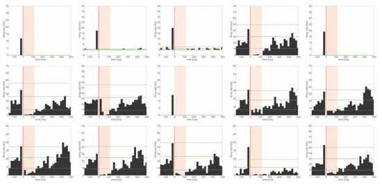 Microstimulation effects on neural activity: single bipolar pulses (20 µA per phase, 100 µs phase duration) were applied at one electrode while the others were recorded. (P)eris(S)timulus(T)ime(H)istograms show a suppression of activity directly after the pulse (red line at time 0) for 100 to 150 ms (red shaded area) at all recorded microelectrodes with spiking activity. Recovery of activity may take up to 400–500 ms. The green line depicts the average firing rate before electrical stimulation. Broken green lines depict two times the standard deviation.