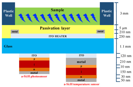 - Caputo, D.; De Cesare, G.; Nascetti, A.; Scipintti, R. a-Si:H temperature sensor integrated in a thin film heater. Phys. Status Solidi A Appl. Mater. Sci. 2010, 207, 708–711. [Google Scholar] [CrossRef]