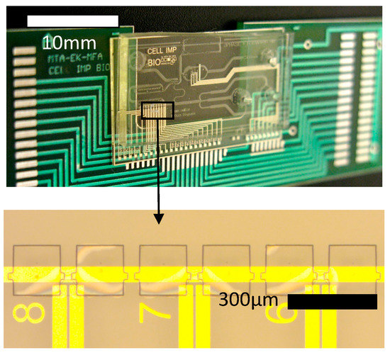 The cell-analytical system was fabricated by deposition and patterning integrated metal (Au) electrodes and formation of multi-layered SU-8 microfluidic structure on glass substrate. For proper sealing a PDMS layer was bonded onto the SU-8 surface by adequate surface modification. The general aim is to encapsulate a single cell in a given droplet—forming a microscopic nL size analytic chamber (Figure 2)—and to move it in a particular trajectory by proper control of droplet generation, progress in microchannels and trapping over the cell-analytical electrode system.