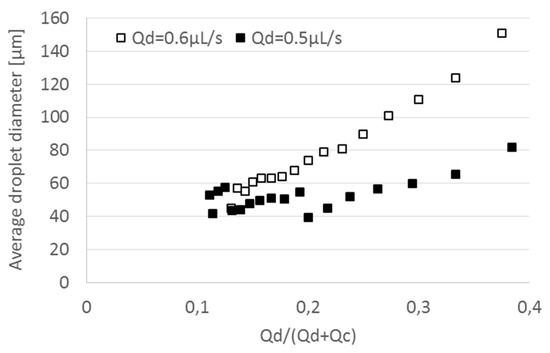 Measured average droplet diameters as the function of the flow rate ratio of continuous (Qc) and disperse phases (Qd) in case of different flow rates of the disperse phase.
