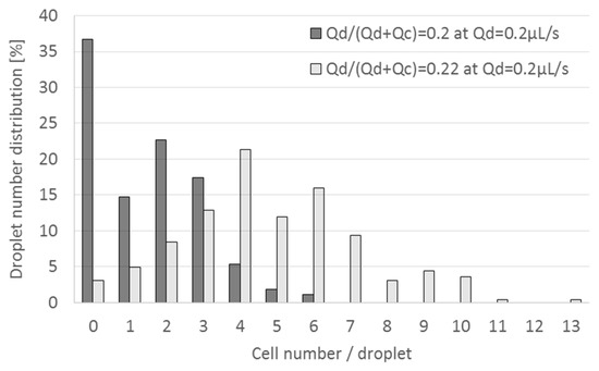 Distribution of the experimentally analysed cell number encapsulated in one droplet in case of different flow rate ratios (droplet sizes).
