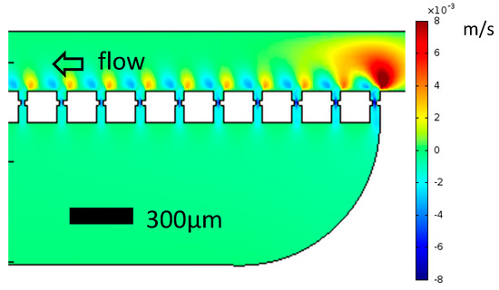 Distribution of the flow velocity component perpendicular to the indicated main flow direction demonstrate the hydrodynamic trapping capability of the microfluidic structure.