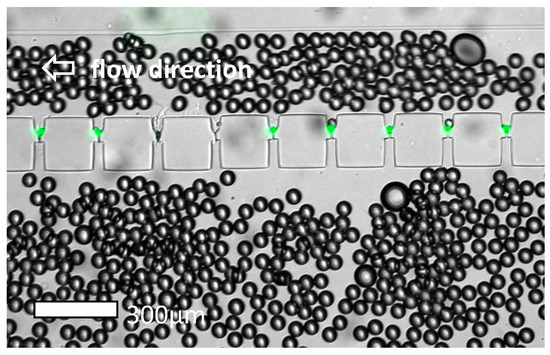 Fluorescent beads encapsulated in generated droplets and trapped in the perforated cavities of the model microfluidic system.