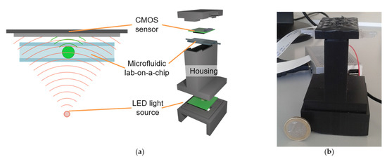 To observe pancreatic cell islets, we realized a fully integrated, compact and portable digital holographic microscope (Figure 1) by combining an LED light engine with a CMOS image sensor and an in-house developed microfluidic perfusion system (MPS) [4]. The distance between the LED-light source and the image sensor is 59.8 mm, and the MPS is placed in direct contact to the image sensor. The MPS has a thickness of 2.2 mm, and due to the micro-channel geometry inside the MPS, the sensor-to-islet distance can be estimated to 1.2 mm. An RGB-LED with peak wavelengths of 466 nm, 517 nm, and 629 nm, respectively, was used as light source, whereas the image acquisition was performed by a Sony IMX219 CMOS-sensor with a pixel pitch of 1.12 µm and a resolution of 3280 × 2465 pixels. Control and data acquisition of the system were done using an embedded system with a Broadcom BCM2837 processor running Raspbian Linux, whereas the image processing was carried out in a regular PC. The raw image data was normalized using a reference image measured without the MPS to minimize the inhomogeneity of the optical system. The holographic images of the MPS and the islets inside were then reconstructed in the Fourier space, applying the angular spectrum method [5] to the normalized data. Afterwards, the twin image and out of focus artifacts were suppressed via twin image elimination method by Latychevskaja and Fink [6].