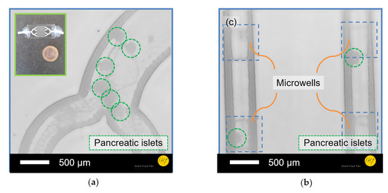 Digital-holographic images of multiple pancreatic islets inside a microfluidic perfusion system (MPS). (a) Islets in a channel bifurcation and an image of the MPS (inset); (b) Islets inside four micro wells that are engraved into two channels.