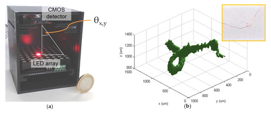 (a) Tomographic setup consisting of RGB-LED matrix, CMOS-sensor, and custom-made 3D-printed housing; (b) Tomographic image of a twisted copper wire (photo in inset).