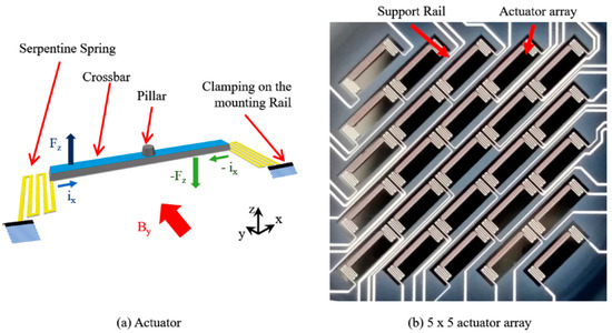 The design concept and working principle of the Lorentz actuators are shown in Figure 1a. The single crystal silicon actuators consist of a thick (rigid) crossbar (2080 µm long, ~26 μm thick) that is supported by flexible serpentine springs (~3 μm thick) on either side. Each actuator is sputter coated with 1.5 µm thick aluminum, with ~30 Ω resistance. The actuators function by Lorentz force coupling between an electric current flowing in the crossbar and a nearby magnet. A 5 × 5 actuator array (Figure 1b) was enabled by implementing narrow and rigid support rails that anchor the actuators to the substrate. The actuator array was formed from a double side polished silicon wafer with three KOH etch processes and finally bonded to the mirror substrate.