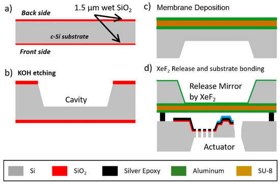 The DPM is fabricated on a second substrate wafer. A 1.5 µm thick wet thermal oxide is grown on the wafer to be used as a KOH etch mask (Figure 2a). Openings are made in the backside oxide using a 10:1 buffered oxide etchant (BOE). Exposed silicon is etched in 30% KOH at 80 °C until a 30 µm silicon membrane remains (Figure 2b). After the backside etch, the front side oxide is removed using BOE. The thick 30 µm silicon membrane is used as the base for fabrication of the mirror, since its large thickness keeps it unbent by stress during the following steps. The front side is coated with a tri-layer of aluminum/SU-8/aluminum (see Figure 2c). The aluminum is 250 µm thick and deposited by thermal evaporation. Then, SU-8-2025 (MicroChem, USA) is spin coated to a thickness of 4 µm to serve as the flexible membrane. To further crosslink the SU-8, a hard bake is done at 150 °C for 60 min. Finally, 250 nm aluminum is deposited. By sandwiching the SU-8 between the two aluminum layers, stress is balanced, maintaining flatness. Finally, a XeF2 gas etch is used to remove the 30 µm underlying silicon, freeing the mirror. Then plasma cleaning is done to the mirror surface in order to remove any remaining silicon. After mirror fabrication, the actuator substrate is bonded to the mirror substrate using silver epoxy (Figure 2d). It is cured at 80 °C for 3 h. Figure 3 shows a picture of the bonded DPM system.
