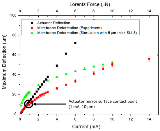 The black squares on Figure 4 are the measured deflection of the Lorentz actuators alone, without being bonded to the DPM, in the presence of 0.35 Tesla magnetic field. The red squares are the measured deflection of the DPM when pushed by the Lorentz actuators. It should be mentioned that after bonding to the mirror substrate, the actuators were spaced 10 µm below the DPM. Accordingly, the first 10 µm of motion is for the actuators moving alone, while subsequent motion are the actuators pushing against the DPM. The green triangles are the simulated deflection of the DPM, for the same actuator current values (and so Lorentz force) of the experimental data of the red circles. Data is taken up to 14 mA current, to maintain actuator temperature below 100 °C. For a moderate mirror deflection of 10 µm, the heating of the actuator is only 10 °C.