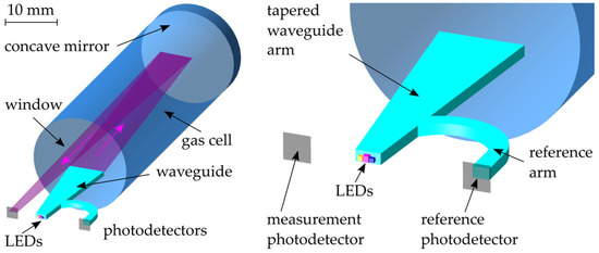whereby I0 and I1 denote the light intensities before and after absorption, respectively. Two reference methods are used to stabilize the sensor signal and realize high resolutions [11]. First, in order to compensate intensity fluctuations of the LED due to temperature changes and ageing effects, both I0 and I1 have to be measured by splitting the light path. In this work, a reference waveguide arm splits the light, which is coupled into the waveguide from several LEDs, into the main measurement path and the reference path (cf. Figure 1). While the reference path guides light to the reference detector, the major part of the light is guided through the waveguide and a silica window into the gas volume. In order to double the path length while keeping the sensor compact, a concave mirror at the end of the 55-mm-long absorption cell reflects and collimates the light back to the measurement detector.