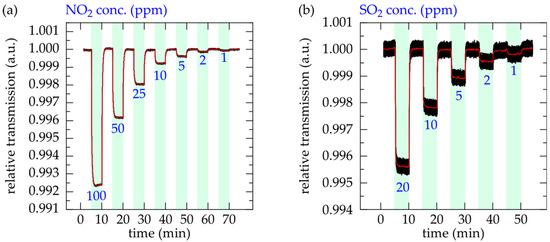 Sensor signal (black) and averaged (n = 10) signal (red) for measuring different concentrations of (a) NO2 (395-nm-LED) and (b) SO2 (280-nm-LED).