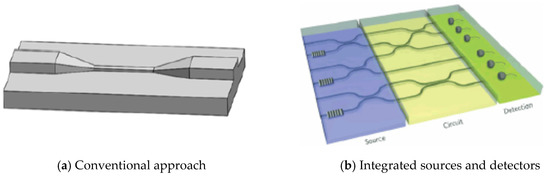 Standalone optical sensors: (a) The conventional approach with a optimized couplers to the source and the detector; (b) The approach where the source and the detector are integrated.