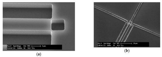 (a) Waveguide definition with the cavity for the SiGe growth; (b) A detector with the metal connections.