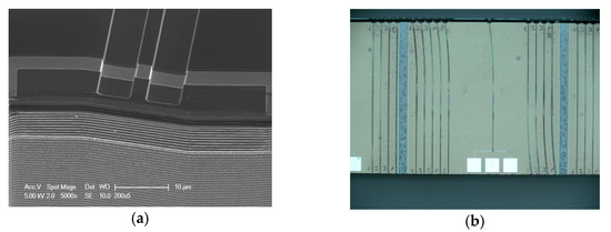 (a) Waveguide end facets to ease the coupling into the waveguide; (b) A fabricated detector with the metal connections.