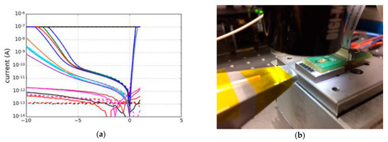 The wafers containing the devices were automatically measured on a probe station. Forward current measurements between 0 and 1 V were at first performed to confirm the diode behavior of the devices. To assess the dark current the voltage was then varied between 0 and −10 V. The results are shown in Figure 5a, indicated values lower than 0.1 nA. These values are much lower than those reported in [5,6], Table 1.