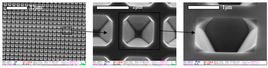 Arrays of periodic perforated inverse pyramids were prepared on polished SOI (silicon-on-insulator) wafers. The 3D structure was shaped by alkaline etching from the front side in the 2 μm thick device layer of the wafer by using the appropriate masking pattern. Periodic vertical tapered microchannels (see Figure 1) were formed by etching away the back-side handler silicon and buried oxide and coated with a 50 nm thick evaporated layer of gold. The resulted geometry was used simultaneously as an array of particle traps and a SERS substrate.