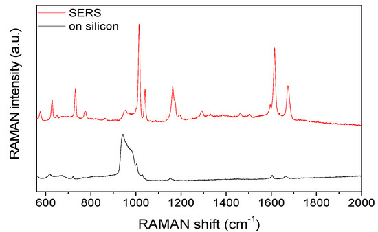 Raman spectra of benzophenone were recorded (by a Renishaw 1000 micro-Raman spectrometer with Leica DM/LM microscope using 1 micron laser spot size on the sample and 785 nm excitation wavelength) on flat silicon and the structured gold surface. The significant amplification by the SERS substrate is presented in Figure 2.