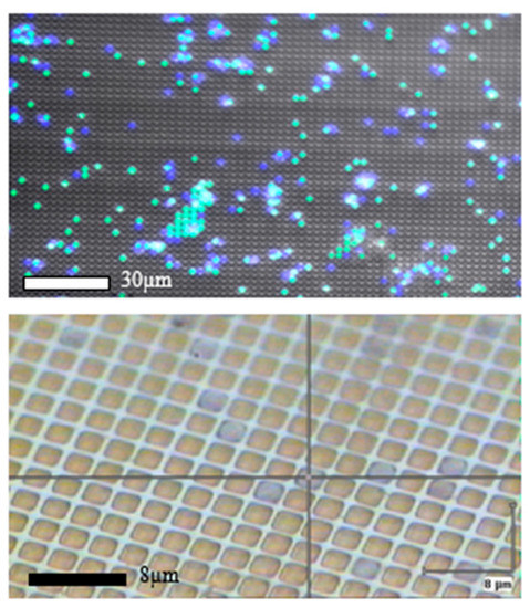 Fluorescent beads with appropriate 2 μm diameter (Sigma Aldrich—green and Spherotech—blue) entrapped in the periodic array of perforated pyramidal structures: multichannel fluorescent image (top) and upright optical micrograph (bottom).