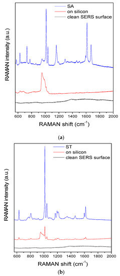 Comparison of the SERS spectra recorded on the clean SERS substrate (black) and different fluorescent beads on silicon (red) and trapped in the periodic array (blue). SA—Sigma Aldrich (a) and ST—Spherotech (b) fluorescent beads, respectively. The broad band in the 900–1000 cm−1 region is arising from the silicon substrate.