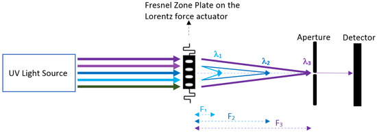 The FZP is placed on top of a MEMS actuator which moves horizontally. F1, F2, and F3 are the focal lengths of λ1, λ2, and λ3 respectively. By moving the FZP the desired wavelength can be focused on the detector.