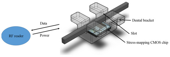 Dental bracket with stress-mapping CMOS chip for telemetric stress measurement during orthodontic therapy (adapted from [2]).
