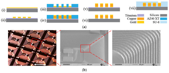 (a) Microcoil fabrication sequence; (i) Seed layer sputter deposition; (ii) Ion beam etching; (iii) 30 μm AZ40XT photolithography; (iv) Cu + Au electroplating; (v) Resist strip in megasonic bath; (vi) Wet selective seed layer etching; (vii) SU-8 encapsulation; (b) 22-μm-high free-standing microcoils with 5 μm linewidth and 15 μm spacing after etching. Vertical layer dimensions in (a) are not to scale.