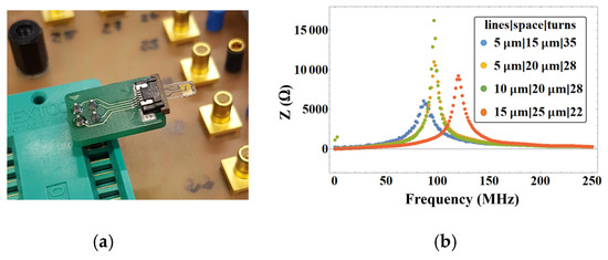 For electrical characterization, the microcoils were connected to a glass rewiring chip by flip-chip bonding. Furthermore, the measurement setup comprises a ZIF connector for the insertion of different microcoils and the network analyzer Agilent 4395A (Keysight Technologies, 71034 Böblingen, Germany). After calibration, the impedance curves were measured and the inductance, (parasitic) capacitance and DC resistance were extracted applying a simple RLC model. The impedance curves were measured for a set of four different microcoils with 22–35 windings, track widths of 5–15 μm and track spaces of 15–25 μm. The measured curves are illustrated in Figure 3b). The extracted inductance values were then compared to numerical simulation results obtained with the freeware tool Fastfieldsolvers (FastFieldSolvers S.R.L, 20871 Vimercate (MB), Italy) [5]. The results are illustrated in Table 1. In summary, the microcoils show inductance values of 1.4–2 μH, parasitic capacitances of about 2 pF, DC resistances of 7–30 Ω and self-resonance frequencies of 80–120 MHz. The coil with the highest inductance of about 2 μH was identified to be the most promising candidate for the system assembly with the stress-mapping CMOS chip in view of its resonant operation at 13.56 MHz.