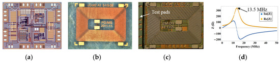 The assembly of the microcoil with the stress-mapping CMOS chip is illustrated in Figure 4. The interconnection was performed by flip-chip bonding. By connecting the indicated test pads using wire-bonding the input impedance of the assembly was measured. The measured impedance curve is illustrated in Figure 4d. The system resonates near the target frequency of 13.56 MHz. The test pads also provide the opportunity to test the functionality of the stress-mapping CMOS chip.