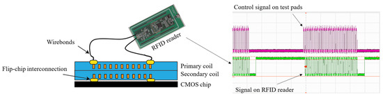 A second microcoil serving as the reader antenna was attached adhesively to the assembly. This reader coil was then connected to the RFID Reader ST25R3911B-DISCO (STMicroelectronics, Geneva, Switzerland) which was controlled via a graphical user interface. The reader is equipped with an automatic tuning feature which tunes the antenna to resonate at 13.56 MHz. The RFID reader can be set to the so-called transparent mode, which allows to read out the raw digital signals. The data packages containing the digital sensor information were extracted at the pins of the RFID reader. The measured digital signal is illustrated in Figure 5.