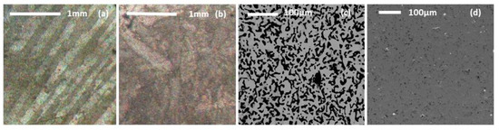 Structural images of miniature disks of Terfenol-D: cut from single crystals rod. (a) cut from cast polycrystalline ingot; (b)-optical images, and hot-pressed from powder (0–38 µm) with conventional heating; (c) and SPS (Spark Plasma Sintering); (d)-SEM images.